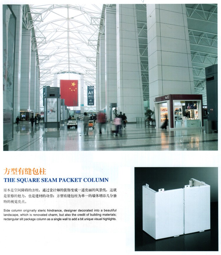 方形有縫包柱鋁單板,原本是空間妨礙的方柱,經過設計師的裝修讓它變成了一道美麗的風景線,這就是方形包柱鋁單板的魅力,它能廣泛的應用在加油站、體育館、地鐵高鐵站等,增加視覺亮點。